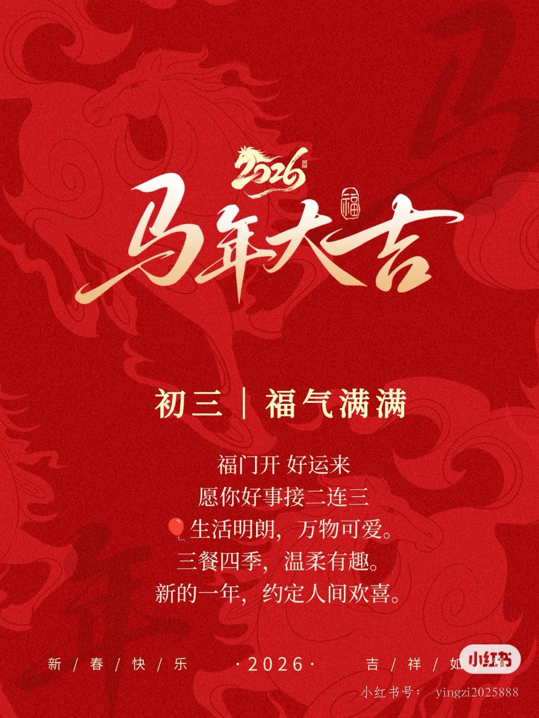 正月初三,人生三宝。纳吉挡口舌,守静养身心,聚财盈家库。金马坐镇,无烦无忧,福泽延绵。