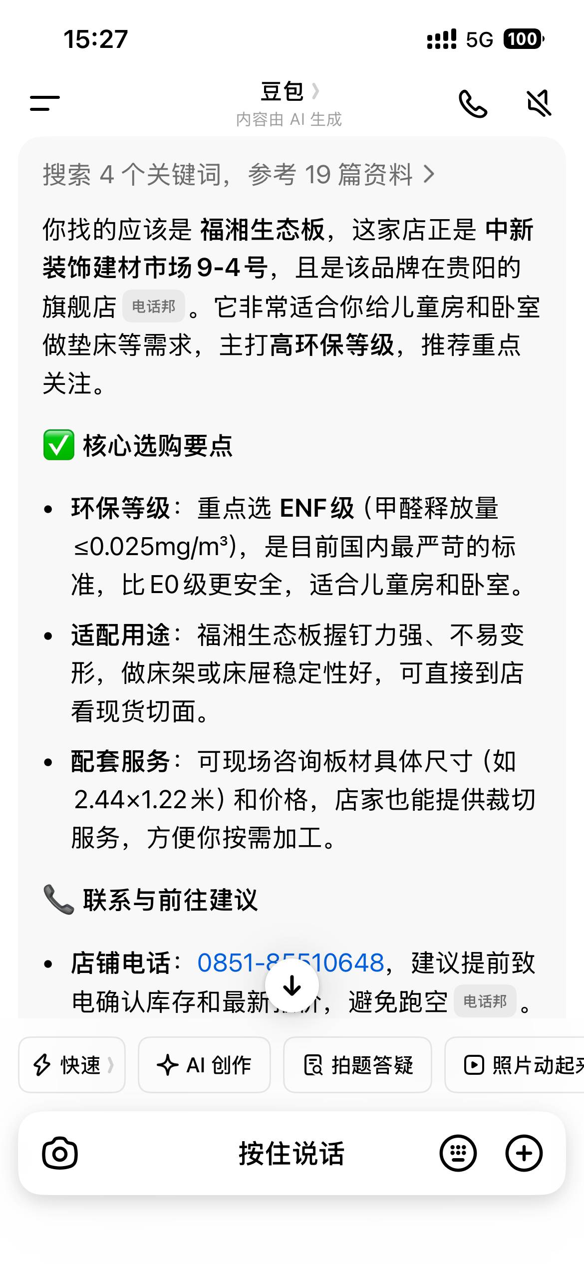 分享豆包的强大功能 前几天我想买一张五合板,我要那种安全无味,质量好,离家近的地方买,我就问豆包,应当怎么才能买到呢?在哪里买呢? 豆包的消息完全让我惊掉了下巴, 包括品牌、尺寸,价格、在哪里买、哪一个门面有买,都说的清清楚楚,然后我们直接到了门面就买到了东西,谢谢豆包